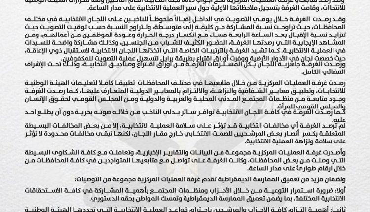 رصدت غرفة العمليات المركزية من خلال متابعيها في مختلف المحافظات تطبيقا كاملا لتعليمات الهيئة الوطنية للانتخابات، وتطبيق معايير الشفافية والنزاهة، والالتزام بالمعايير الدولية المتعارف عليها، كما رصدت الغرفة وجود متابعة من منظمات المجتمع المدني المحلية والعربية والدولية ومن المجلس القومي لحقوق الإنسان والمجلس القومي للمرأة.