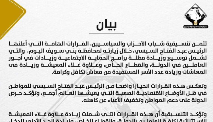 تثمن تنسيقية شباب الأحزاب والسياسيين، القرارات الهامة التي أعلنها الرئيس عبد الفتاح السيسي، خلال زيارته لمحافظة بني سويف اليوم، والتي تشمل توسيع وزيادة مظلة برامج الحماية الاجتماعية وزيادات في أجور العاملين في الدولة، والقطاع الخاص، وعلاوة غلاء المعيشة وزيادة فى المعاشات وزيادة عدد الأسر المستفيدة من معاش تكافل وكرامة.
