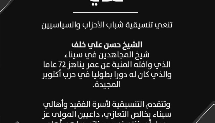 تنعي تنسيقية شباب الأحزاب والسياسيين الشيخ حسن علي خلف شيخ المجاهدين في سيناء الذي وافته المنية عن عمر يناهز ٧٢ عاما والذي كان له دورا بطوليا في حرب أكتوبر المجيدة.