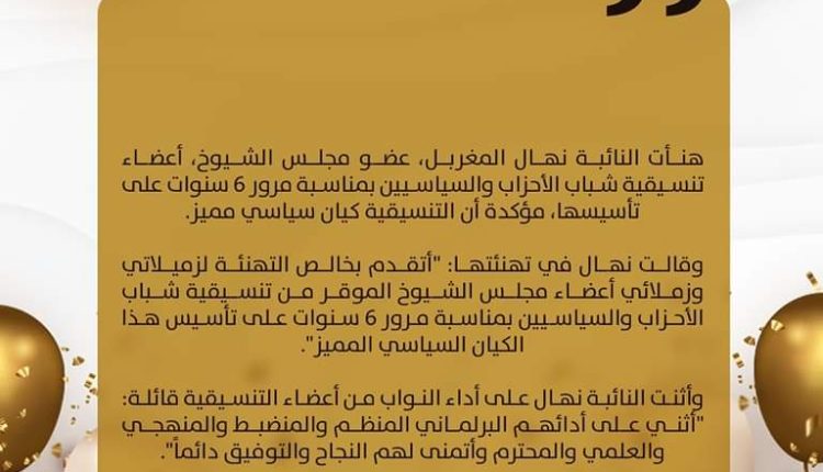 وقالت نهال في تهنئتها: “أتقدم بخالص التهنئة لزميلاتي وزملائي أعضاء مجلس الشيوخ الموقر من تنسيقية شباب الأحزاب والسياسيين بمناسبة مرور 6 سنوات على تأسيس هذا الكيان السياسي المميز”.
