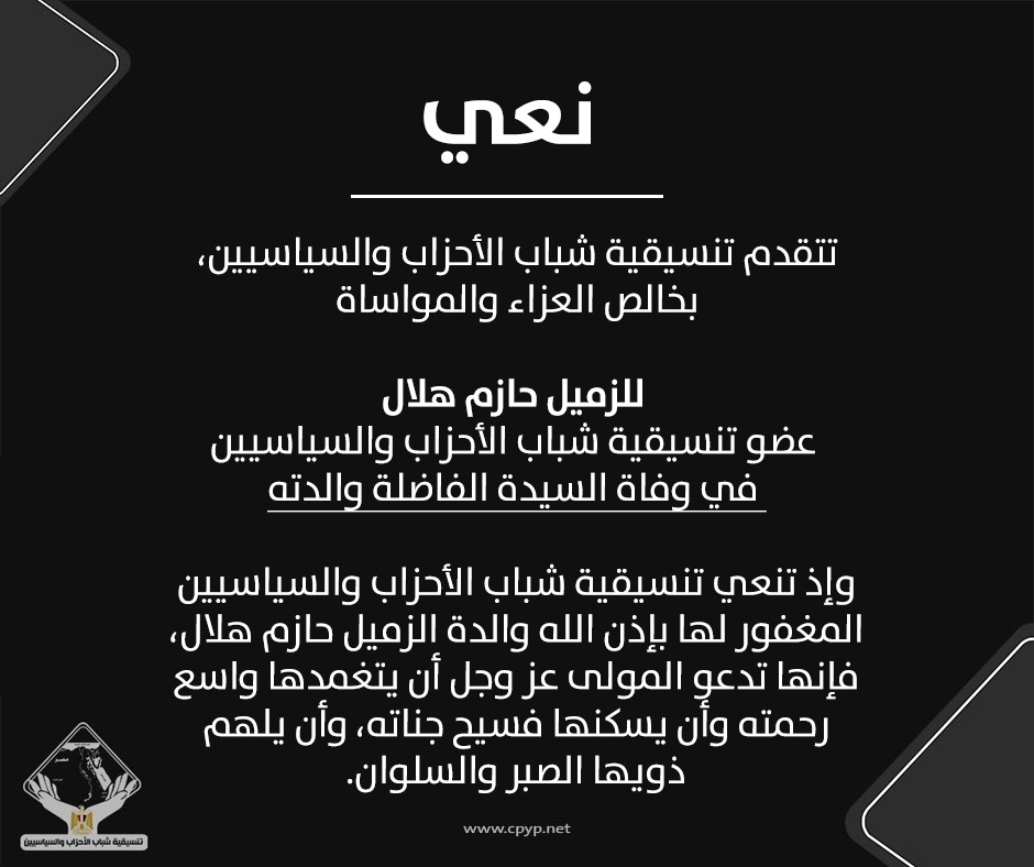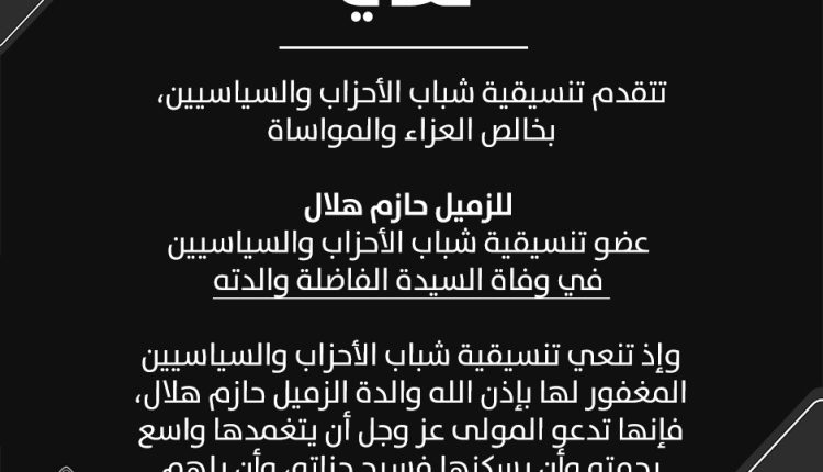 وإذ تنعي تنسيقية شباب الأحزاب والسياسيين المغفور لها بإذن الله والدة الزميل حازم هلال، فإنها تدعو المولى عز وجل أن يتغمدها واسع رحمته وأن يسكنها فسيح جناته، وأن يلهم ذويها الصبر والسلوان.