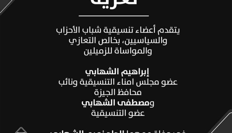 الأخبار تعزية بواسطة مدير الموقع في Nov 24, 2021 شارك يتقدم أعضاء تنسيقية شباب الأحزاب والسياسيين، بخالص التعازي والمواساة للزميلين، إبراهيم الشهابي عضو مجلس امناء التنسيقية ونائب محافظ الجيزة، ومصطفى الشهابي عضو التنسيقية، في وفاة عمهما الحاج نعيم الشهابي. داعين الله أن يتقبله في الصالحين. شارك FacebookTwitterGoogle+ReddItWhatsAppPinterestالبريد الإلكتروني