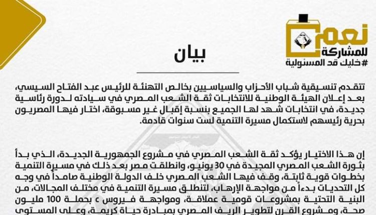 تتقدم تنسيقية شباب الأحزاب والسياسيين بخالص التهنئة للرئيس عبد الفتاح السيسي، بعد إعلان الهيئة الوطنية للانتخابات ثقة الشعب المصري في سيادته لدورة رئاسية جديدة، في انتخابات شهد لها الجميع بنسبة إقبال غير مسبوقة، اختار فيها المصريون بحرية رئيسهم لاستكمال مسيرة التنمية لست سنوات قادمة.
