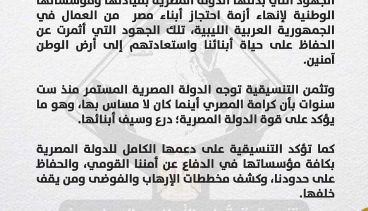 وتثمن التنسيقية توجه الدولة المصرية المستمر منذ ستة سنوات بأن كرامة المصري أينما كان لا مساس بها، وهو ما يؤكد على قوة الدولة المصرية؛ درع وسيف أبنائها.