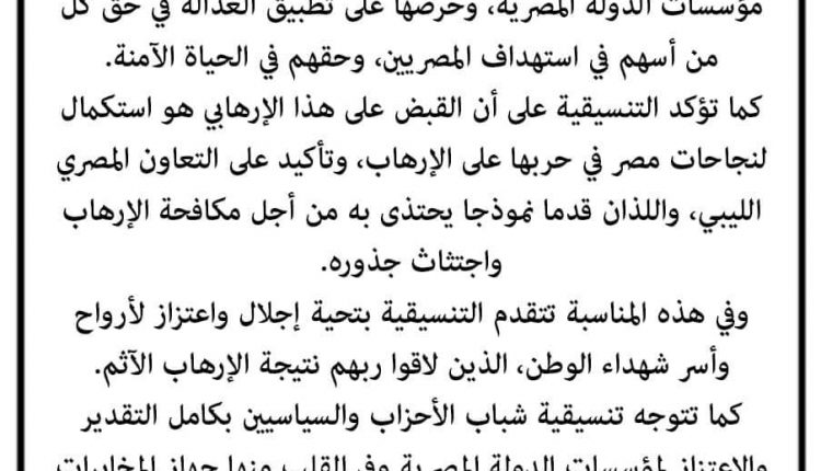 تلقت تنسيقية شباب الأحزاب والسياسيين بمشاعر الفخر والإعزاز عملية تسليم الإرهابى الهارب هشام عشماوى، مما يؤكد يقظة مؤسسات الدولة المصرية وحرصها على تطبيق العدالة فى حق كل من أسهم فى استهداف المصريين وحقهم فى الحياة الآمنة، كما تؤكد التنسيقية على أن القبض على هذا الإرهابى هو استكمال لنجاحات مصر فى حربها على الإرهاب وتأكيد على التعاون المصرى الليبى واللذين قدما نموذجا يحتذى من أجل مكافحة الإرهاب واجتثاث حذوره.