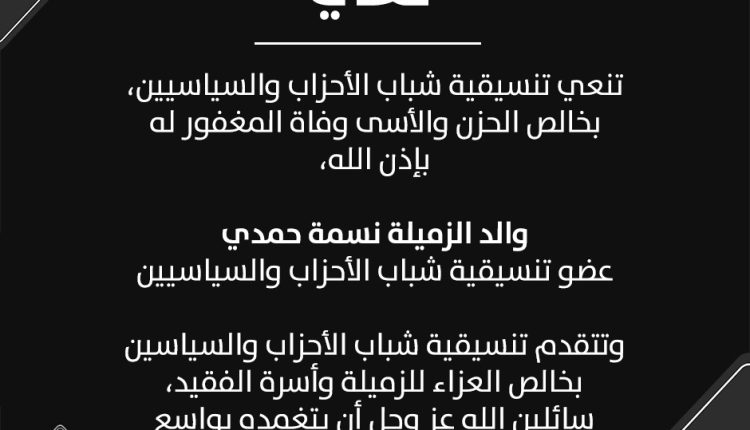 وتتقدم تنسيقية شباب الأحزاب والسياسين بخالص العزاء للزميلة وأسرة الفقيد، سائلين الله عز وجل أن يتغمده بواسع رحمته وأن يلهم ذويه الصبر والسلوان.