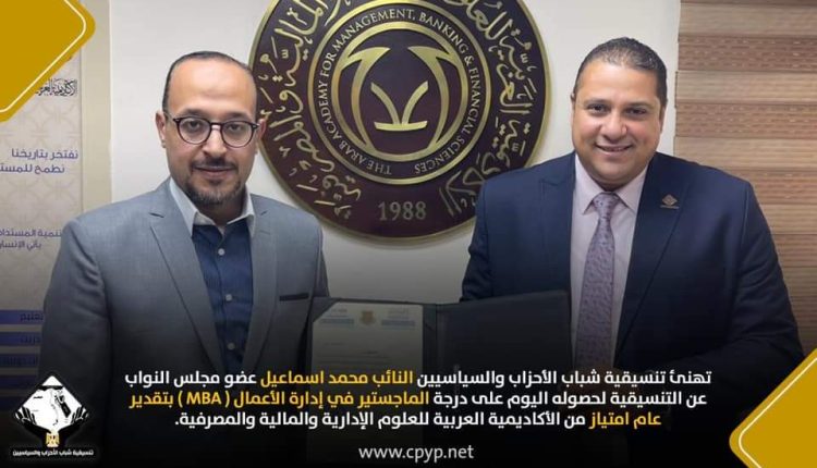 تهنئ تنسيقية شباب الأحزاب والسياسيين النائب محمد اسماعيل عضو مجلس النواب عن التنسيقية لحصوله اليوم على درجة الماجستير في إدارة الأعمال ( MBA ) بتقدير عام امتياز من الأكاديمية العربية للعلوم الإدارية والمالية والمصرفية.