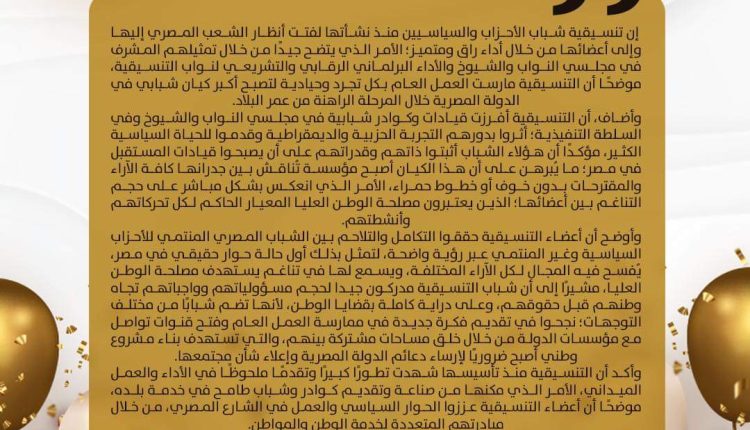 وأضاف، أن التنسيقية أفرزت قيادات وكوادر شبابية في مجلسي النواب والشيوخ وفي السلطة التنفيذية؛ أثروا بدورهم التجربة الحزبية والديمقراطية وقدموا للحياة السياسية الكثير، مؤكدًا أن هؤلاء الشباب أثبتوا ذاتهم وقدراتهم على أن يصبحوا قيادات المستقبل في مصر؛ ما يُبرهن على أن هذا الكيان أصبح مؤسسة تُناقش بين جدرانها كافة الآراء والمقترحات بدون خوف أو خطوط حمراء، الأمر الذي انعكس بشكل مباشر على حجم التناغم بين أعضائها؛ الذين يعتبرون مصلحة الوطن العليا المعيار الحاكم لكل تحركاتهم وأنشطتهم.
