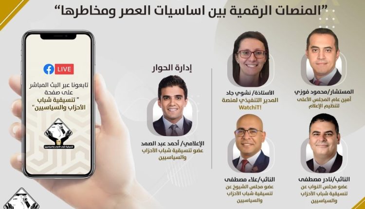 يطرح صالون تنسيقية شباب الأحزاب والسياسيين نقاش حول دور المنصات الرقمية المختلفة وتأثيرها على الفرد والمجتمع وذلك عبر الصفحة الرسمية للتنسيقية على موقع التواصل الاجتماعي فيسبوك غدا الثلاثاء الساعة ٩ مساء.