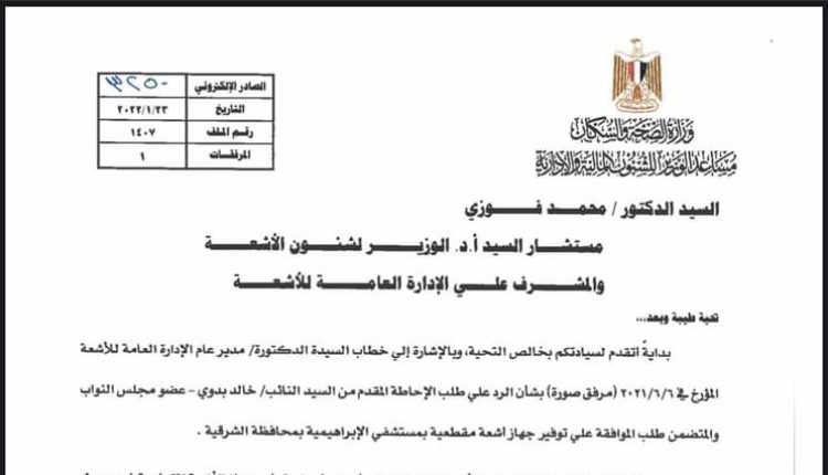 نجح النائب الدكتور خالد بدوى، عضو مجلس النواب عن تنسيقية شباب الأحزاب والسياسيين، في الحصول على جهاز أشعة مقطعية لمستشفى الإبراهيمية المركزي بمحافظة الشرقية بعد جهد استمر لمدة عام، وذلك عقب تقدمه بطلب إحاطة في مجلس النواب.