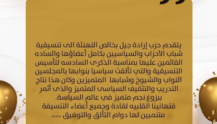 يتقدم حزب إرادة جيل بخالص التهنئة الى تنسيقية شباب الأحزاب والسياسيين بكامل أعضاؤها والساده القائمين عليها بمناسبة الذكرى السادسه لتأسيس التنسيقية والتي تألقت سياسيا بنوابها بالمجلسين النواب والشيوخ وشبابها المتميزين وكان هذا نتاج التدريب والتثقيف السياسى المتميز والذى أثمر ببزوغ نجم متميز في عالم السياسة.