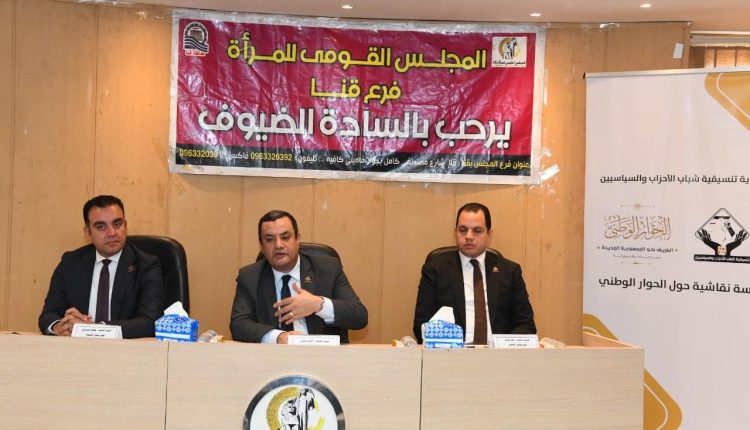 في إطار اهتمام تنسيقية شباب الأحزاب والسياسيين، بعقد الجلسات النقاشية مع المواطنين حول الحوار الوطني، بمختلف ‏محافظات الجمهورية لسماع آرائهم حول القضايا المختلفة التي سيتم طرحها خلال جلسات الحوار الوطني المقرر ‏انطلاقها خلال الفترة المقبلة، عقدت التنسيقية جلسة نقاشية بمقر المجلس القومي للمرأة بمحافظة قنا، بحضور ومشاركة الدكتور ‏حازم عمر، نائب محافظ قنا وعضو مجلس أمناء تنسيقية شباب الأحزاب والسياسيين وعدد من أعضاء مجلس الشيوخ بالتنسيقية .