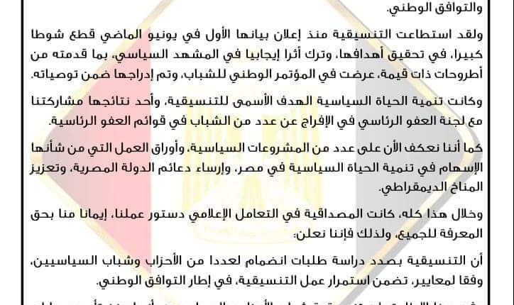 أن التنسيقية بصدد دراسة طلبات انضمام لعدد من الأحزاب وشباب السياسيين وفقًا لمعايير تضمن استمرار عمل