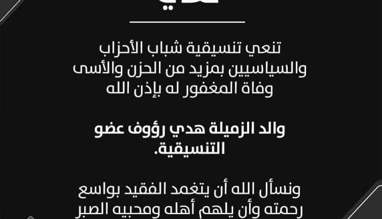تنعي تنسيقية شباب الأحزاب والسياسيين بمزيد من الحزن والأسى وفاة المغفور له بإذن الله والد الزميلة هدي رؤوف عضو التنسيقية.