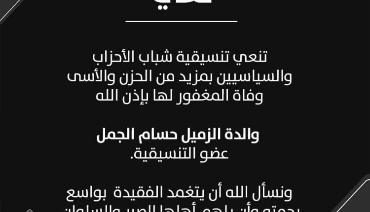 تنعي تنسيقية شباب الأحزاب والسياسيين بمزيد من الحزن والأسى وفاة المغفور لها بإذن الله والدة الزميل حسام الجمل عضو التنسيقية.