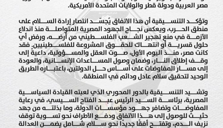 وتشيد التنسيقية بالدور المحوري الذي لعبته القيادة السياسية المصرية، برئاسة السيد الرئيس عبد الفتاح السيسي، في رعاية المفاوضات وتضافر جهود مؤسسات الدولة، وما بذلته من جهد حثيث للوصول إلى هذا الاتفاق ودفع الأطراف نحو تسوية توقف نزيف الدم، وتفتح أفقًا جديدًا نحو سلام شامل يضمن العدالة والكرامة للشعب الفلسطيني، ويحافظ على أمن واستقرار المنطقة بأسرها.