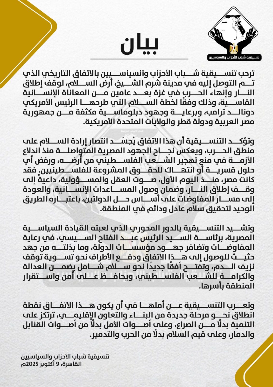 ترحب تنسيقية شباب الأحزاب والسياسيين بالاتفاق التاريخي الذي تم التوصل إليه في مدينة شرم الشيخ، أرض السلام، لوقف إطلاق النار وإنهاء الحرب في غزة بعد عامين من المعاناة الإنسانية القاسية، وذلك وفقًا لخطة السلام التي طرحها الرئيس الأمريكي دونالد ترامب، وبرعاية وجهود دبلوماسية مكثفة من جمهورية مصر العربية ودولة قطر والولايات المتحدة الأمريكية.