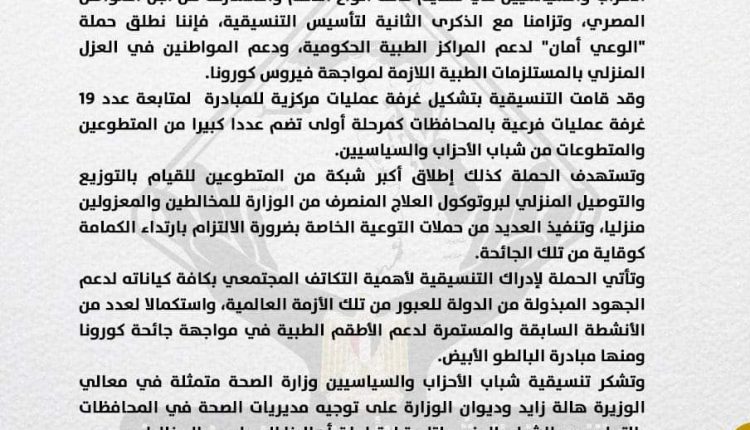 بالتعاون مع وزارة الصحة والسكان المصرية، وانطلاقاً من دور تنسيقية شباب الأحزاب والسياسيين في تقديم كافة أنواع الدعم والمشاركة من أجل المواطن المصري، وتزامناً مع الذكرى الثانية لتأسيس التنسيقية، فإننا نطلق حملة “الوعي أمان” لدعم المراكز الطبية الحكومية، ودعم المواطنين في العزل المنزلي بالمستلزمات الطبية اللازمة لمواجهة فيروس كورونا.