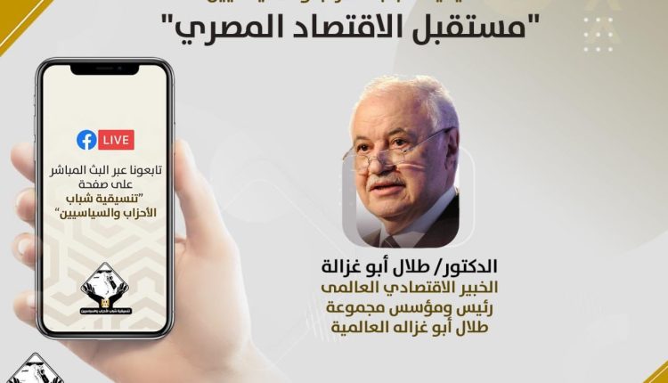 تعقد تنسيقية شباب الأحزاب والسياسيين، غدا الاحد ، الساعة الرابعة والنصف، جلسة حوارية بعنوان ” مستقبل الاقتصاد المصرى ” مع الدكتور طلال أبو غزالة، الخبير الاقتصادي العالمى، رئيس ومؤسس مجموعة طلال أبو غزاله العالمية، وذلك ضمن مبادرة “سوا هنعدي”.