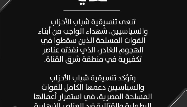 تنعى تنسيقية شباب الأحزاب والسياسيين، شهداء الواجب من أبناء القوات المسلحة الذين سقطوا في الهجوم الغادر، الذي نفذته عناصر تكفيرية في منطقة شرق القناة.
