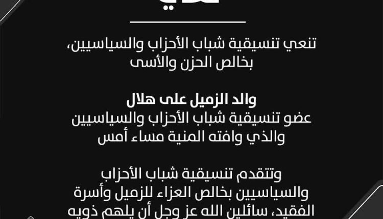 وتتقدم تنسيقية شباب الأحزاب والسياسيين بخالص العزاء للزميل وأسرة الفقيد، سائلين الله عز وجل أن يلهم ذويه الصبر والسلوان.