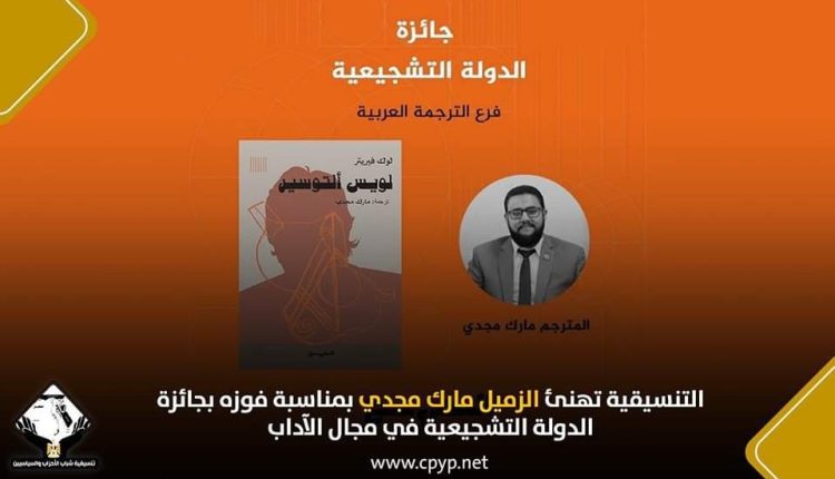 تهنئ تنسيقية شباب الأحزاب والسياسيين، الزميل مارك مجدي، بمناسبة فوزه بجائزة الدولة التشجيعية في مجال الآداب فرع الترجمة من العربية وإليها، عن ترجمة كتاب «لويس ألتوسير».