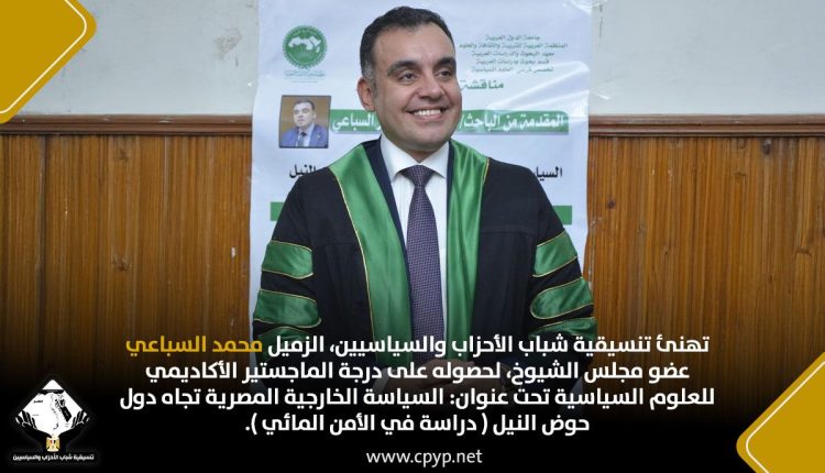 تهنئ تنسيقية شباب الأحزاب والسياسيين، الزميل محمد السباعي عضو مجلس الشيوخ، لحصوله على درجة الماجستير الأكاديمي للعلوم السياسية تحت عنوان: السياسة الخارجية المصرية تجاه دول حوض النيل ( دراسة في الأمن المائي ).