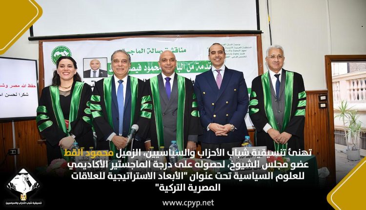 تهنئ تنسيقية شباب الأحزاب والسياسيين، الزميل محمود القط عضو مجلس الشيوخ، لحصوله على درجة الماجستير الأكاديمي للعلوم السياسية تحت عنوان “الأبعاد الاستراتيجية للعلاقات المصرية التركية”