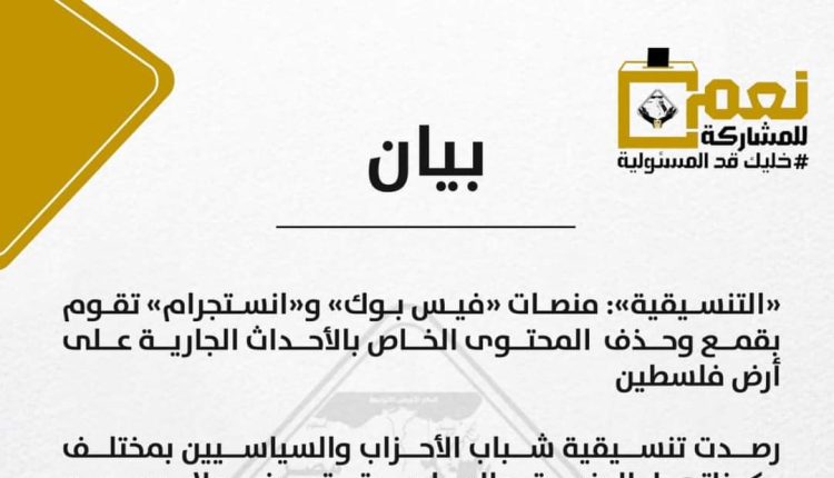 «التنسيقية»: منصات «فيس بوك» و«انستجرام» تقوم بقمع وحذف المحتوى الخاص بالأحداث الجارية على أرض فلسطين