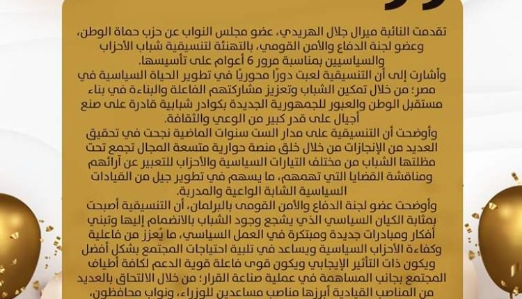 تقدمت النائبة ميرال جلال الهريدي، عضو مجلس النواب عن حزب حماة الوطن، وعضو لجنة الدفاع والأمن القومي، بالتهنئة لتنسيقية شباب الأحزاب والسياسيين بمناسبة مرور 6 أعوام على تأسيسها.