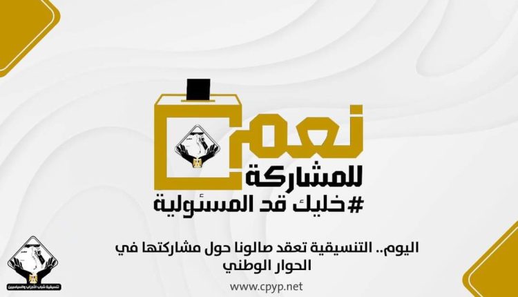 يذكر أن تنسيقية شباب الأحزاب والسياسيين، أعلنت عن إطلاق سلسلة من الصالونات النقاشية، تبث مباشرة على الصفحة الرسمية للتنسيقية، حول نتائج ومخرجات جلسات الحوار الوطني.