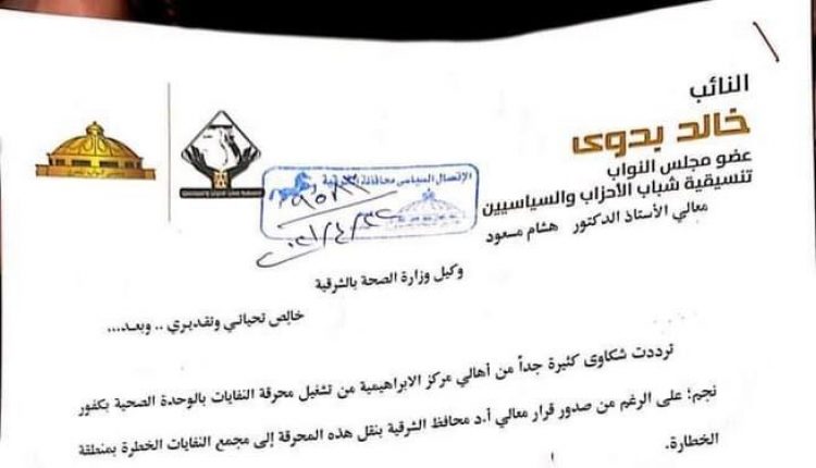 وافقت مديرية الصحة بالشرقية، على الطلب المقدم من الدكتور خالد بدوي، عضو مجلس النواب عن تنسيقية شباب الأحزاب والسياسين، بنقل محرقة وحدة طب أسرة كفور نجم بالإبراهيمية، إلى مجمع الخطارة بعد معاناة الأهالي لمدة 15 عاما.