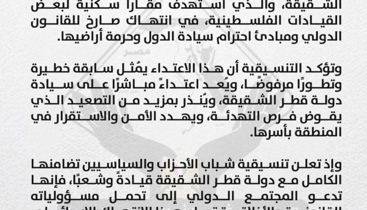 تعرب تنسيقية شباب الأحزاب والسياسيين عن إدانتها الشديدة واستنكارها البالغ للهجوم العدواني الذي شنته قوات الاحتلال الإسرائيلي على أراضي دولة قطر الشقيقة، والذي استهدف مقارًا سكنية لبعض القيادات الفلسطينية، في انتهاك صارخ للقانون الدولي ومبادئ احترام سيادة الدول وحرمة أراضيها.