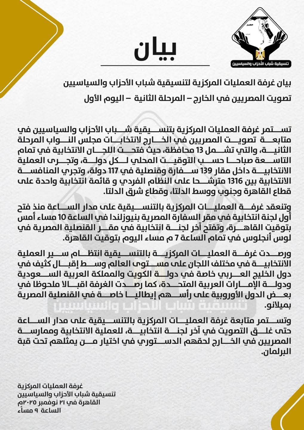 تستمر غرفة العمليات المركزية بتنسيقية شباب الأحزاب والسياسيين في متابعة تصويت المصريين في الخارج لانتخابات مجلس النواب المرحلة الثانية، والتي تشمل 13 محافظة، حيث فتحت اللجان الانتخابية في تمام التاسعة صباحا حسب التوقيت المحلي لكل دولة، وتجرى العملية الانتخابية داخل مقار 139 سفارة وقنصلية في 117 دولة، وتجري المنافسة الانتخابية بين 1316 مترشحا على النظام الفردي و قائمة انتخابية واحدة على قطاع القاهرة وجنوب ووسط الدلتا، وقطاع شرق الدلتا.