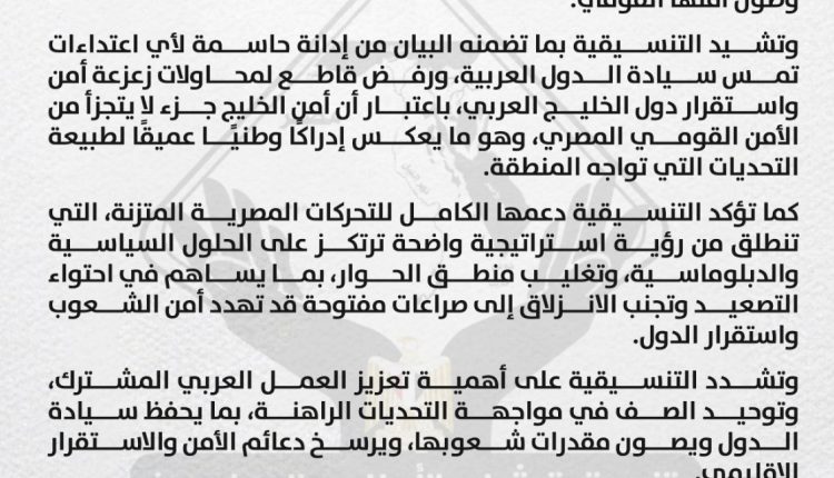 وتشيد التنسيقية بما تضمنه البيان من إدانة حاسمة لأي اعتداءات تمس سيادة الدول العربية، ورفض قاطع لمحاولات زعزعة أمن واستقرار دول الخليج العربي، باعتبار أن أمن الخليج جزء لا يتجزأ من الأمن القومي المصري، وهو ما يعكس إدراكًا وطنيًا عميقًا لطبيعة التحديات التي تواجه المنطقة.