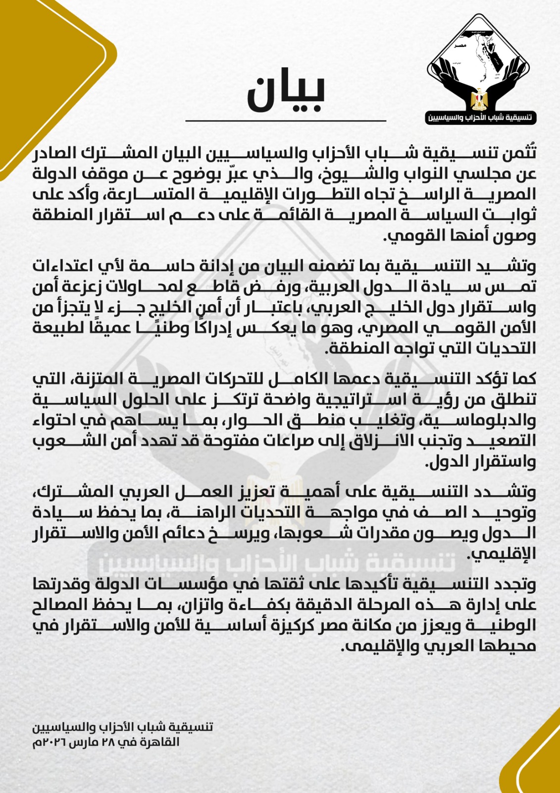 تُثمن تنسيقية شباب الأحزاب والسياسيين البيان المشترك الصادر عن مجلسي النواب والشيوخ، والذي عبّر بوضوح عن موقف الدولة المصرية الراسخ تجاه التطورات الإقليمية المتسارعة، وأكد على ثوابت السياسة المصرية القائمة على دعم استقرار المنطقة وصون أمنها القومي.