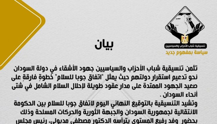 تثمن تنسيقية شباب الأحزاب والسياسيين جهود الأشقاء في دولة السودان نحو تدعيم استقرار دولتهم حيث يمثل “اتفاق جوبا للسلام” خطوةٍ فارقةٍ على صعيد الجهود الممتدة على مدار عقود طويلة لإحلال السلام الشامل في شتى أنحاء السودان.