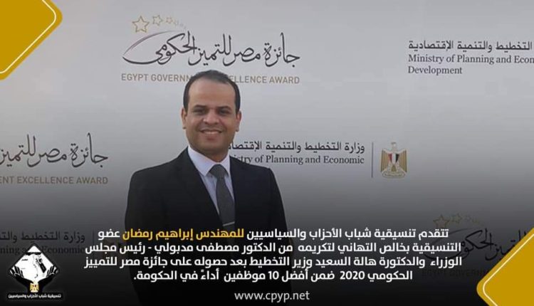 تتقدم تنسيقية شباب الأحزاب والسياسيين للمهندس إبراهيم رمضان عضو التنسيقية بخالص التهاني لتكريمه من الدكتور مصطفى مدبولي – رئيس مجلس الوزراء والدكتورة هالة السعيد وزير التخطيط بعد حصوله على جائزة مصر للتمييز الحكومي ٢٠٢٠ ضمن أفضل 10 موظفين أداءً في الحكومة.
