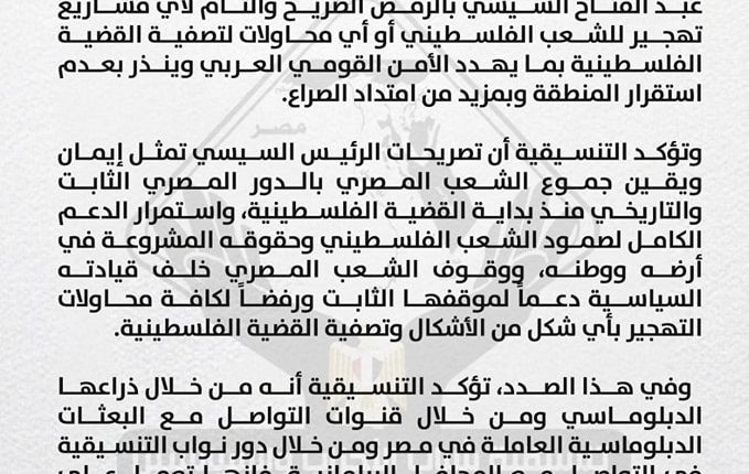 وتؤكد التنسيقية أن تصريحات الرئيس السيسي تمثل إيمان ويقين جموع الشعب المصري بالدور المصري الثابت والتاريخي منذ بداية القضية الفلسطينية، واستمرار الدعم الكامل لصمود الشعب الفلسطيني وحقوقه المشروعة في أرضه ووطنه، ووقوف الشعب المصري خلف قيادته السياسية دعماً لموقفها الثابت ورفضاً لكافة محاولات التهجير بأي شكل من الأشكال وتصفية القضية الفلسطينية.