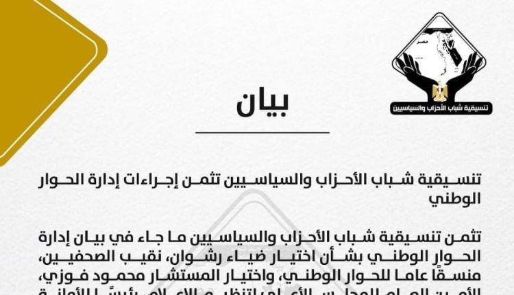 تثمن تنسيقية شباب الأحزاب والسياسيين ما جاء في بيان إدارة الحوار الوطني بشأن اختيار ضياء رشوان، نقيب الصحفيين، منسقًا عاما للحوار الوطني، واختيار المستشار محمود فوزي، الأمين العام للمجلس الأعلى لتنظيم الإعلام، رئيسًا للأمانة الفنية اللحوار الوطني.