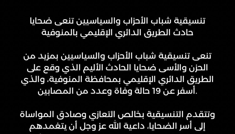 تنسيقية شباب الأحزاب والسياسيين تنعى ضحايا حادث الطريق الدائري الإقليمي بالمنوفية