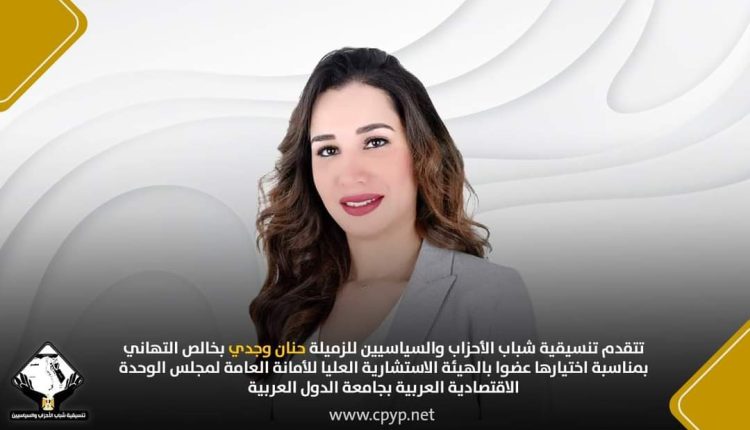 تتقدم تنسيقية شباب الأحزاب والسياسيين للزميلة حنان وجدي بخالص التهاني بمناسبة اختيارها عضوا بالهيئة الاستشارية العليا للأمانة العامة لمجلس الوحدة الاقتصادية العربية بجامعة الدول العربية.. وتتمني التنسيقية للزميلة حنان وجدي دوام التوفيق والسداد.