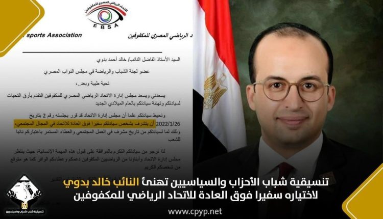 تتقدم تنسيقية شباب الأحزاب والسياسيين بخالص التهاني للنائب خالد بدوي عضو مجلس النواب عن تنسيقية شباب الأحزاب والسياسيين بمناسبة اختياره سفيرا فوق العادة من قبل الاتحاد الرياضي المصري للمكفوفين للأعمال المجتمعية لما له من تاريخ طويل ومشرف في العمل المجتمعي والعطاء المستمر.