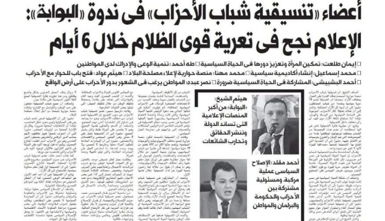 تغطية صحفية لجريدة البوابة نيوز الورقى الصادرة اليوم السبت الموافق ٢٠١٩/١١/٢ و ذلك عن مشاركة مجموعة من أعضاء تنسيقية شباب الأحزاب و السياسيين بندوة حوارية بجريدة «البوابة نيوز»، و الحديث عن خطة عمل التنسيقية، وسبل الإصلاح السياسي في مصر، ومستقبل الأحزاب في ظل الوضع الحالي، وخطة التنسيقية لتدريب وتأهيل الكوادر النسائية.