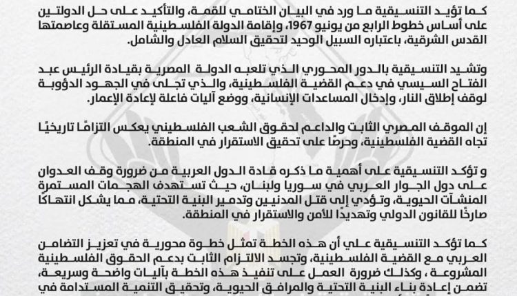 كما تؤيد التنسيقية ما ورد في البيان الختامي للقمة، والتأكيد على حل الدولتين على أساس خطوط الرابع من يونيو 1967، وإقامة الدولة الفلسطينية المستقلة وعاصمتها القدس الشرقية، باعتباره السبيل الوحيد لتحقيق السلام العادل والشامل.