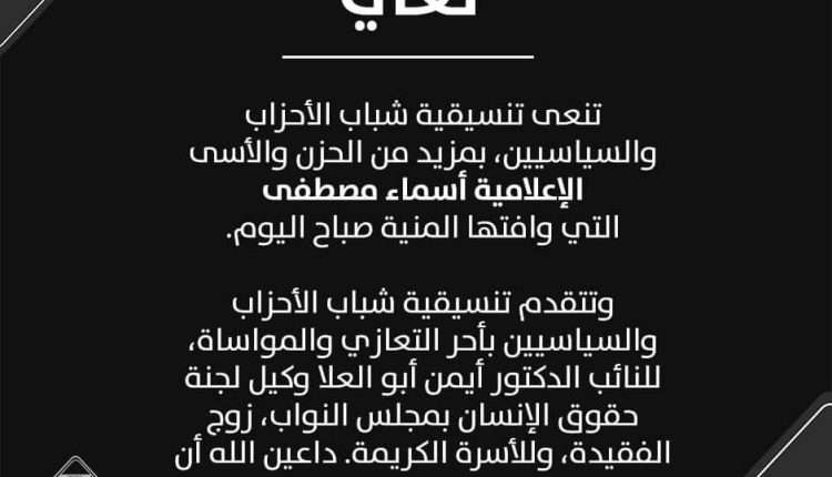 تنعى تنسيقية شباب الأحزاب والسياسيين، بمزيد من الحزن والأسى، الإعلامية أسماء مصطفى التي وافتها المنية صباح اليوم.