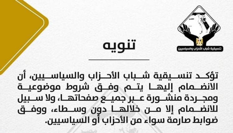 وتحذر تنسيقية شباب الأحزاب والسياسيين، من استخدام اسمها في أي نشاط لا يتعلق بها ودون إذن منها، كما تؤكد أنه لا يوجد رسوم لعضوية التنسيقية أو رسوم مالية لاستمارة التقديم للعضوية.