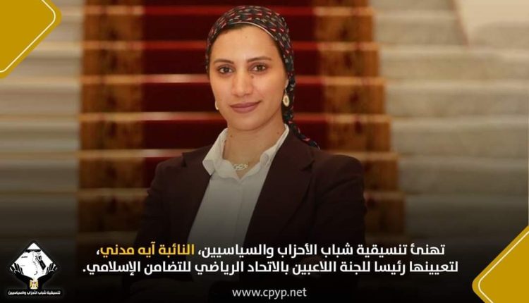 تهنئ تنسيقية شباب الأحزاب والسياسيين، النائبة آيه مدني، لتعيينها رئيسا للجنة اللاعبين بالاتحاد الرياضي للتضامن الإسلامي.