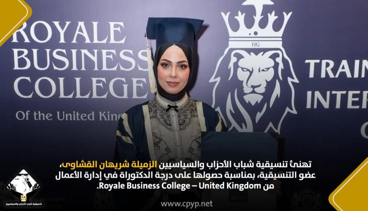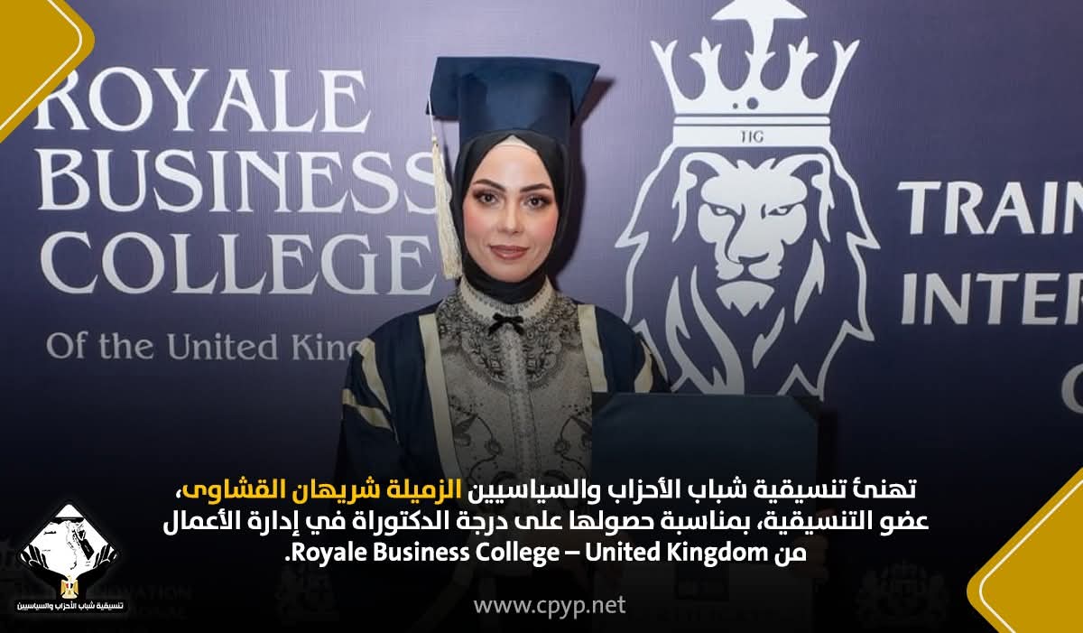 الأخبار تهنئة بواسطة مدير الموقع في Dec 6, 2025 شارك تهنئ تنسيقية شباب الأحزاب والسياسيين الزميلة شريهان القشاوى، عضو التنسيقية، بمناسبة حصولها على درجة الدكتوراة في إدارة الأعمال من Royale Business College – United Kingdom. شارك FacebookTwitterGoogle+ReddItWhatsAppPinterestالبريد الإلكتروني
