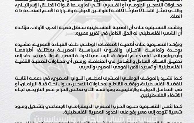 وتؤكد التنسيقية على أهمية الاصطفاف الوطني خلف القيادة المصرية، مشيدة بوحدة وتماسك الأحزاب والقوى السياسية المصرية بمختلف أطيافها وأيديولوجياتها في دعم الموقف الرسمي للدولة المصرية، والذي يهدف إلى تحقيق السلام العادل والشامل في المنطقة، ورفض أي محاولات لتصفية القضية الفلسطينية أو تهديد الأمن القومي المصري والعربي.